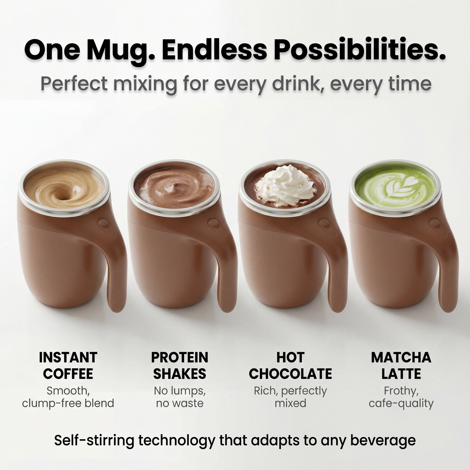 From morning coffee with creamer to post-workout protein shakes, hot chocolate to matcha—AutoBrew handles it all. Every drink blends perfectly with zero clumps, no chalky texture, no sediment. One mug, endless beverage possibilities.